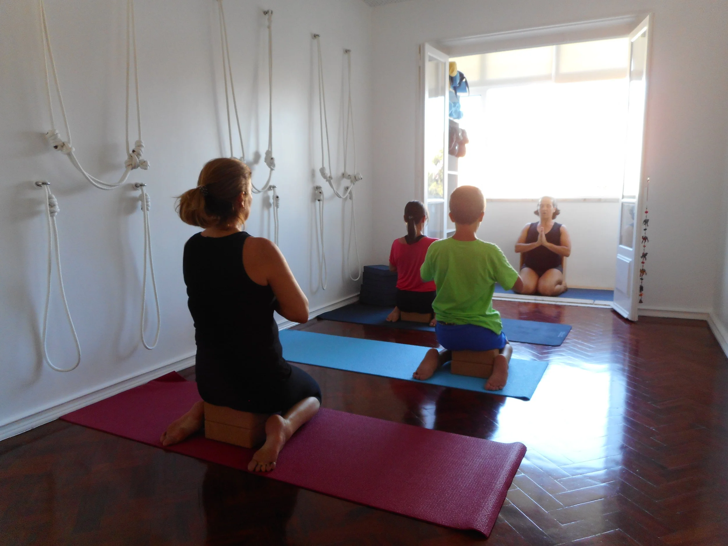It is equipped with genuine Iyengar method props, such as a rope wall, blankets, belts, bricks, ballsters, and weights. Students buy their own sticky mats which can be left at the studio.